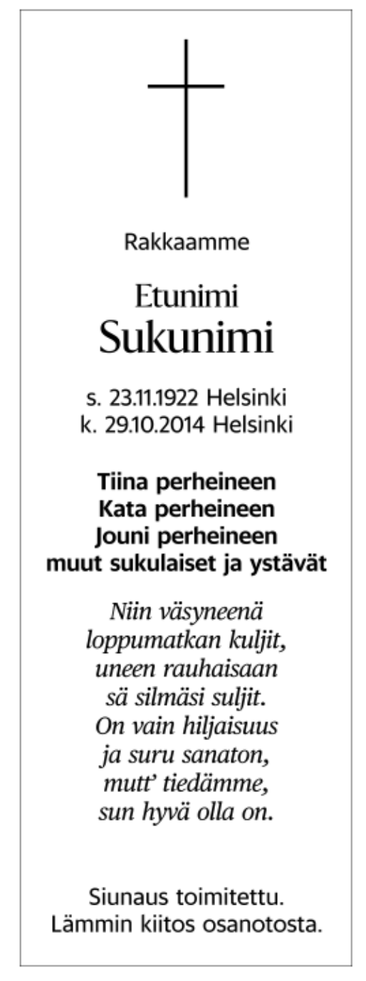 Haluatko muistaa vainajaa kauniilla ja perinteisellä tavalla? Kuolinilmoitus lehdessä on arvokas tapa kertoa läheisen poismenosta ja pitää hänen muistonsa elossa. Me Lohtu-hautauksessa autamme suunnittelemaan ja välittämään kuolinilmoitukset eri lehtiin, jotta voit jakaa tiedon läheisen poismenosta. Voimme luoda yksilöllisen ja räätälöidyn kuolinilmoituksen, joka heijastaa vainajan muistoa. Ymmärrämme, että jokainen kuolinilmoitus on erityinen, ja siksi haluamme auttaa sinua löytämään juuri sopivan ilmaisun ja muodon. Alla on muutamia esimerkkejä kuolinilmoituksista, jotka voivat inspiroida sinua muistamaan läheistäsi juuri sopivalla tavalla.